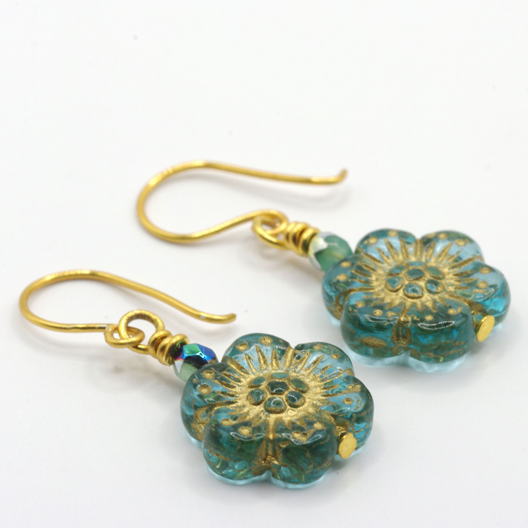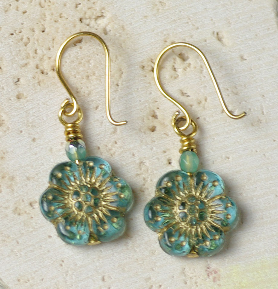 These adorable little earrings are a big hit at shows, and it’s easy to see why. Small but impactful, they feature dainty blue Czech glass flowers that dangle from handmade, 12K gold-filled ear wires that lend a handmade yet elegant touch. A tiny, fire-polished Czech glass bead lends just the right amount of sparkle. These earrings hang a smidge over 1″ in length and will bring a touch of springtime to your look.