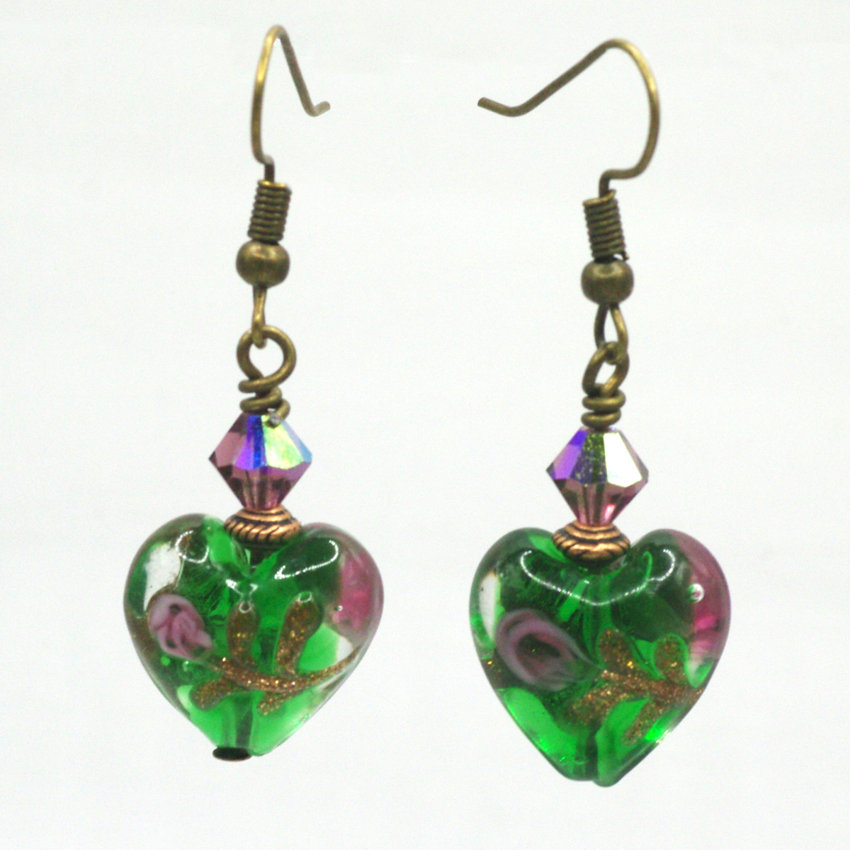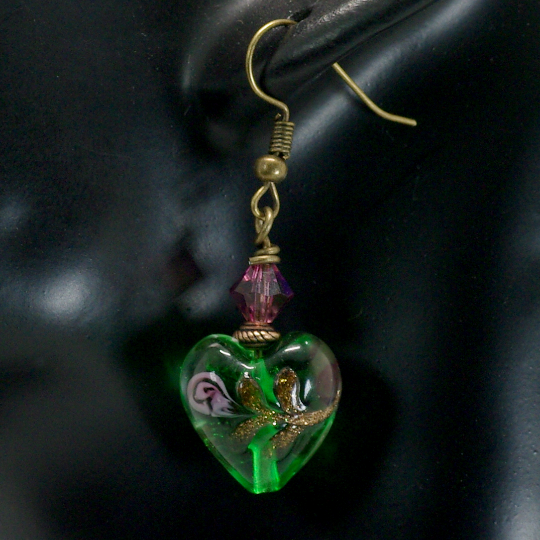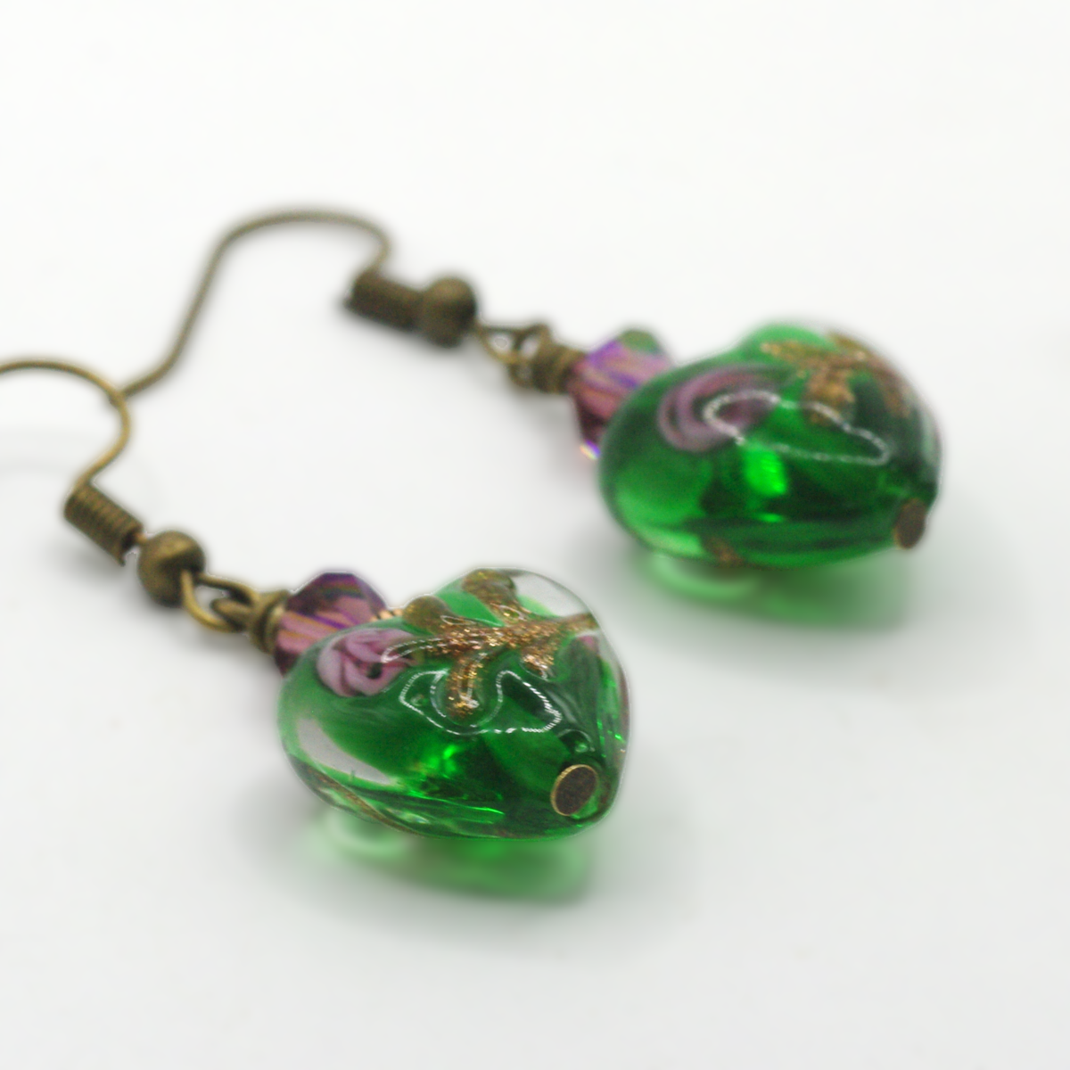 Enchanting green glass heart beads are decorated with glittery gold leaves and pink flowers. They are quite small and delicate-looking, with an old-fashioned charm. I added antique brass findings and a sparkling crystal, and the result reminds me of something you’d find in a vintage shop or thrift store. (I think that’s a good thing.)