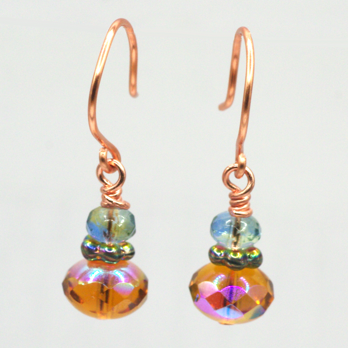 Sometimes simple things come together in a way that’s really special, as these unassuming little earrings prove. The iridescent glass beads catch and play with the light in wonderful ways. This finish is called “aurora borealis,” and it lives up to its name. Grab some sparkle! Slather it on your toast!
