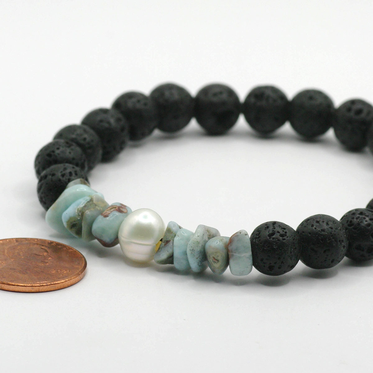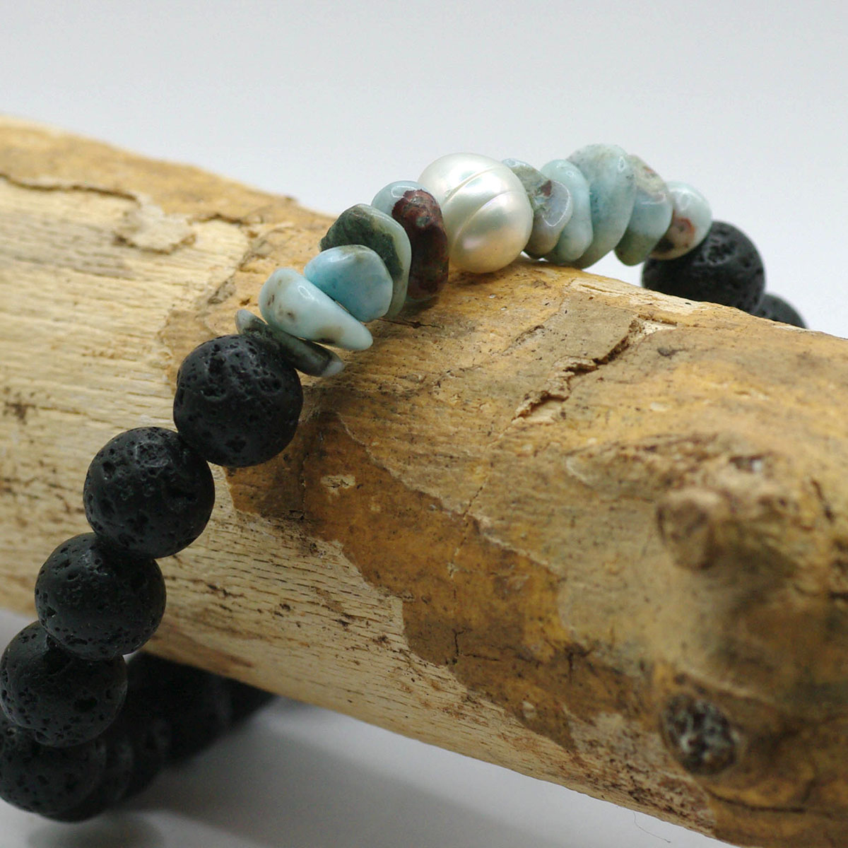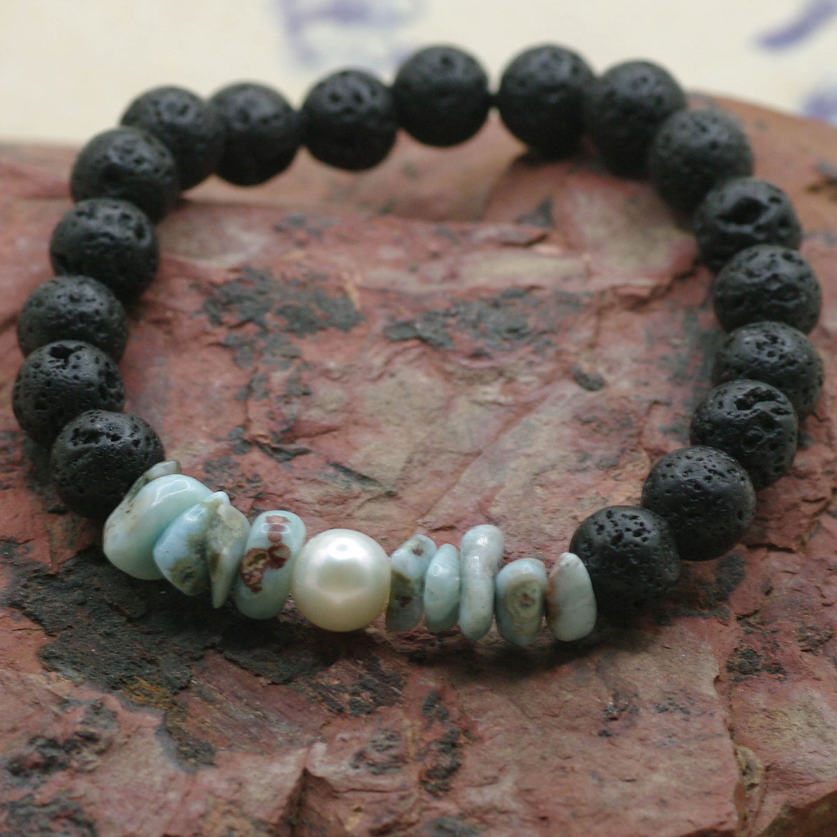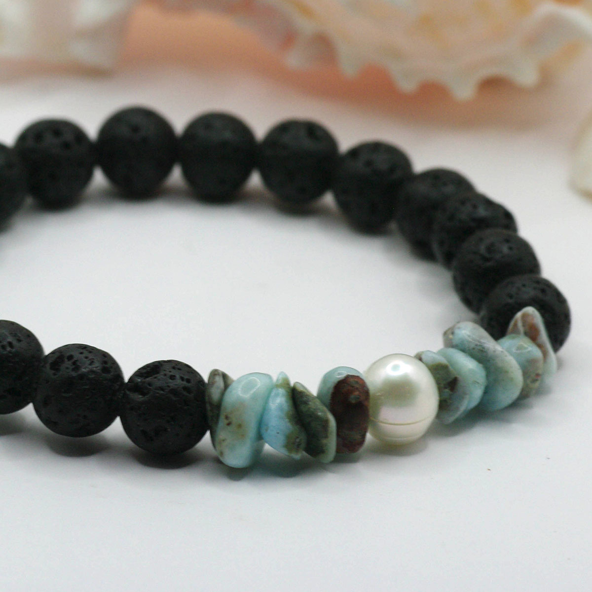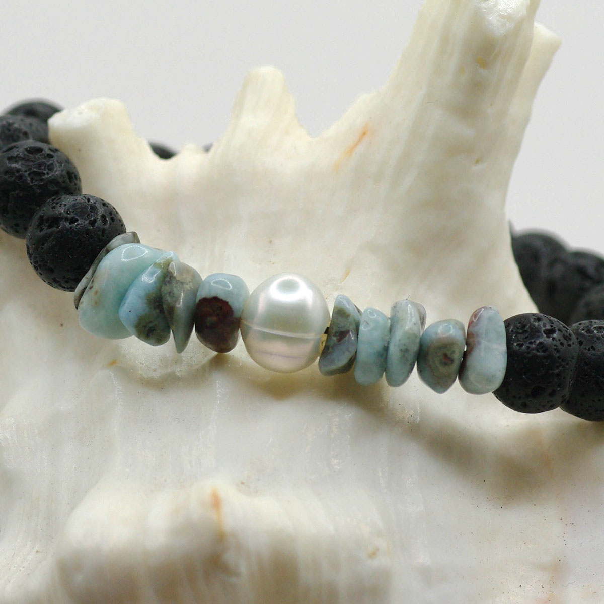 The lava rocks are a nod to Larimar’s volcanic origins, and can be dabbed with your favorite essential oil for an aromatherapy pick-me-up. The bracelet is finished with a chunky, freshwater pearl, because pearls are awesome.