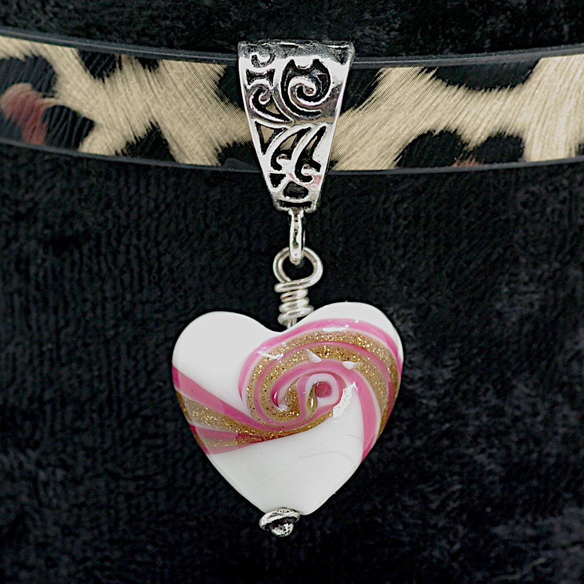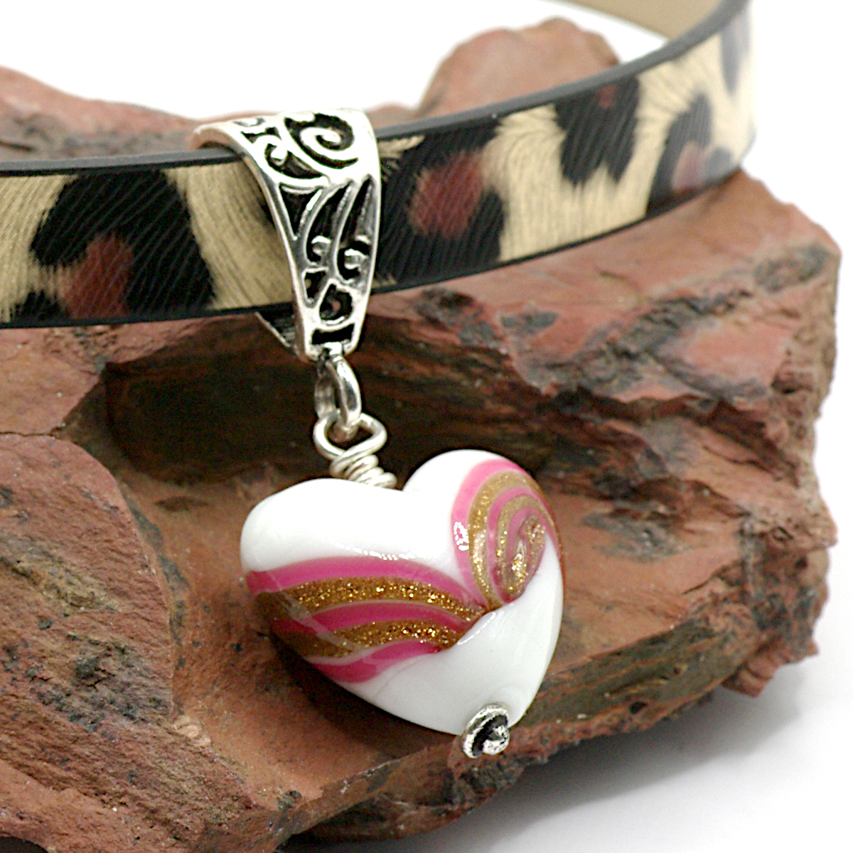 The heart-shaped glass bead is big, puffy, and swirled with pink and gold glitter. It’s cute as can be, and it knows it. Cuter still: Add the matching Pink Swirl Glass Heart Earrings.