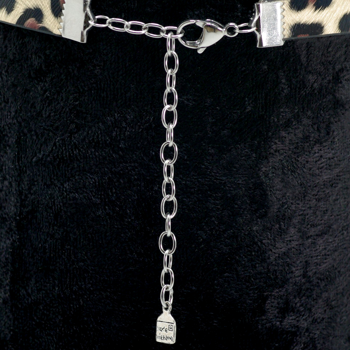 An homage to the inimitable Betsey Johnson, this choker is fun, flirty, and a little bit over-the-top. The bonded-leather, leopard-print band is fairly stiff, so it rests like a collar rather than draping. Yes, I did put “bonded”,” leather”, and “collar” together there. Do with that what you will.