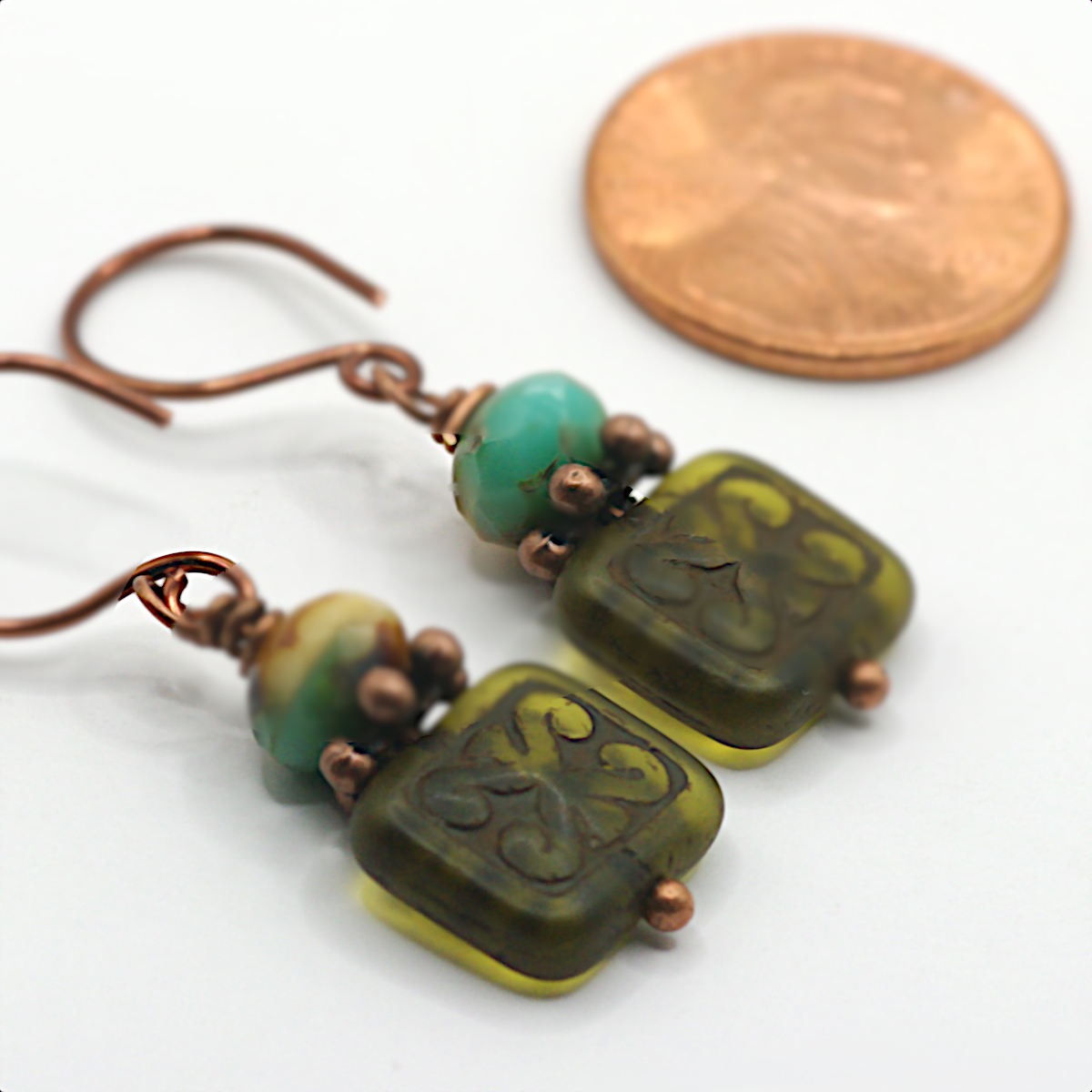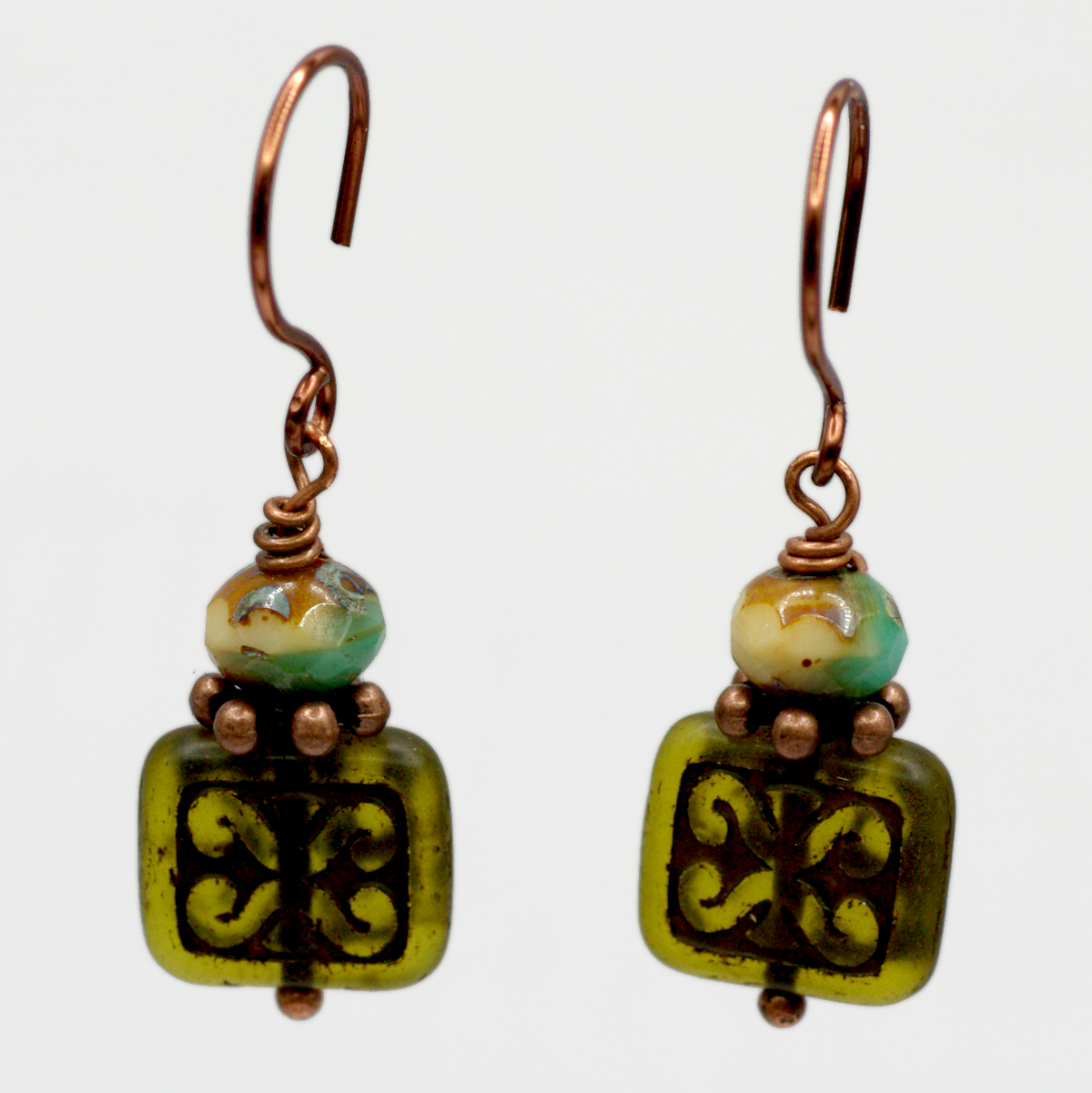 The not-quite-square beads in these earrings display what appears to be a ram’s horn symbol, or dwennimmen, which stands for strength tempered by humility. What a winning combination! They are a deep, kelpy green that comes alive in the sunlight. Faceted glass beads on top offer a blend of beachy hues. The bare copper wire will darken over time, a process that can be hastened by lingering on the deck of a caravel, pondering your next destination.