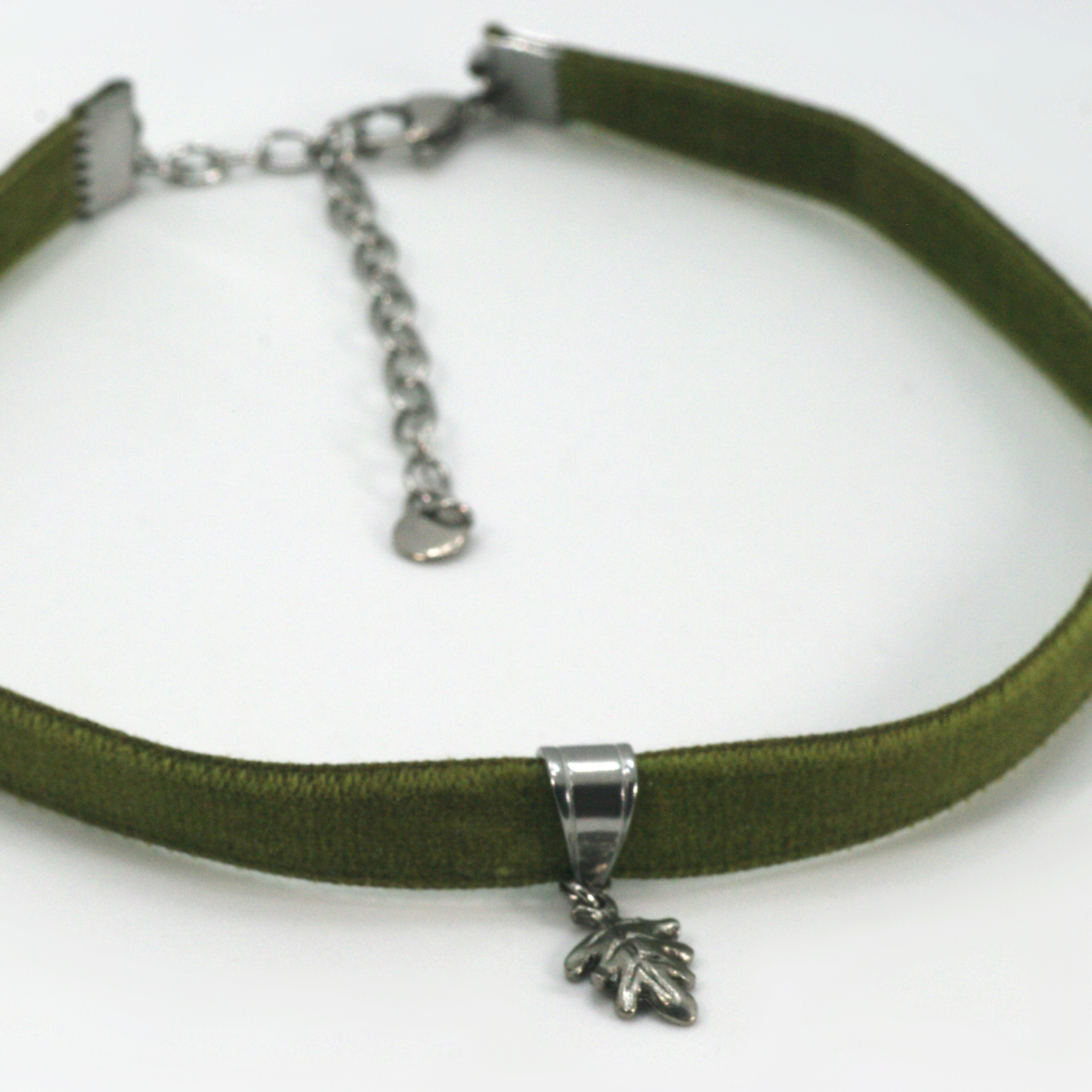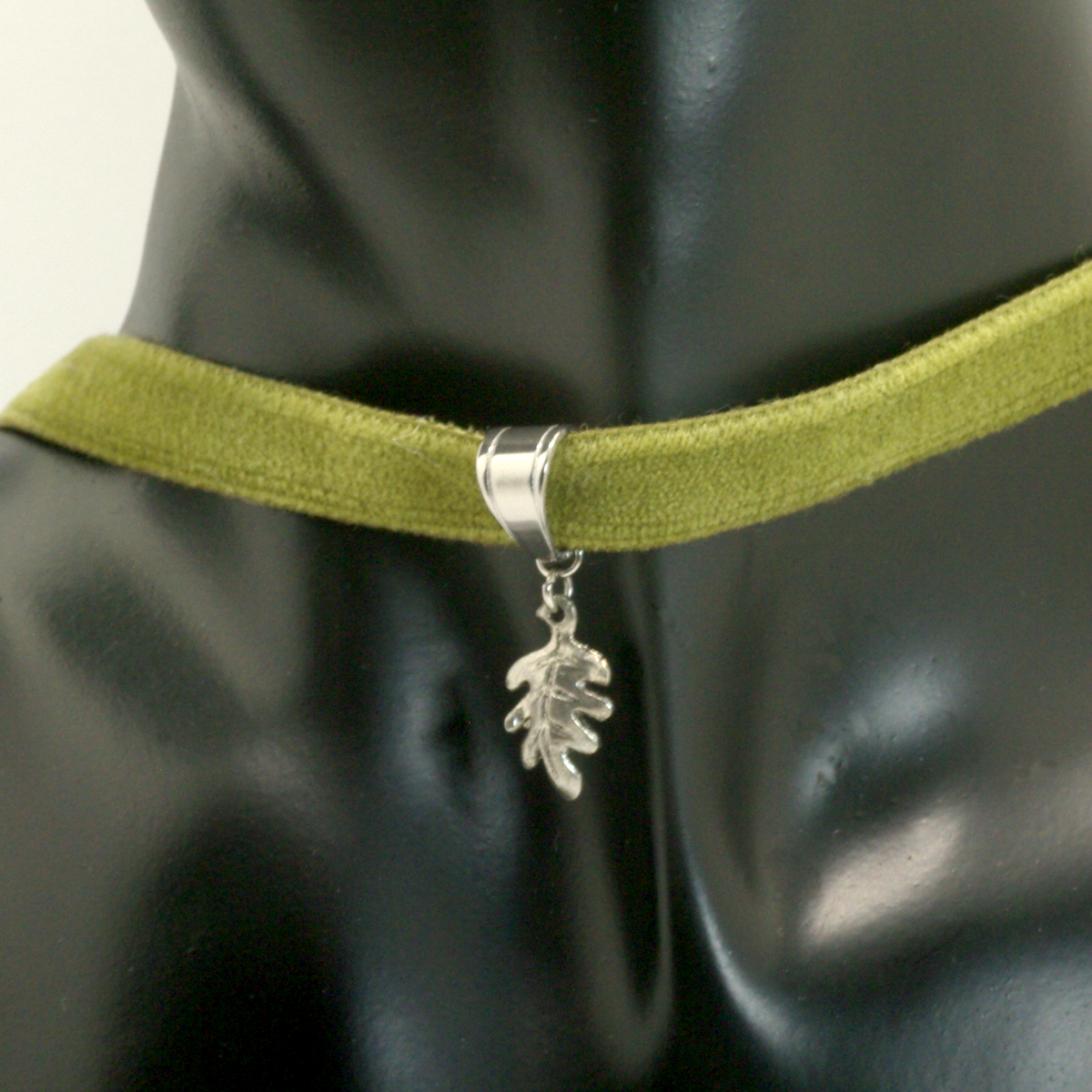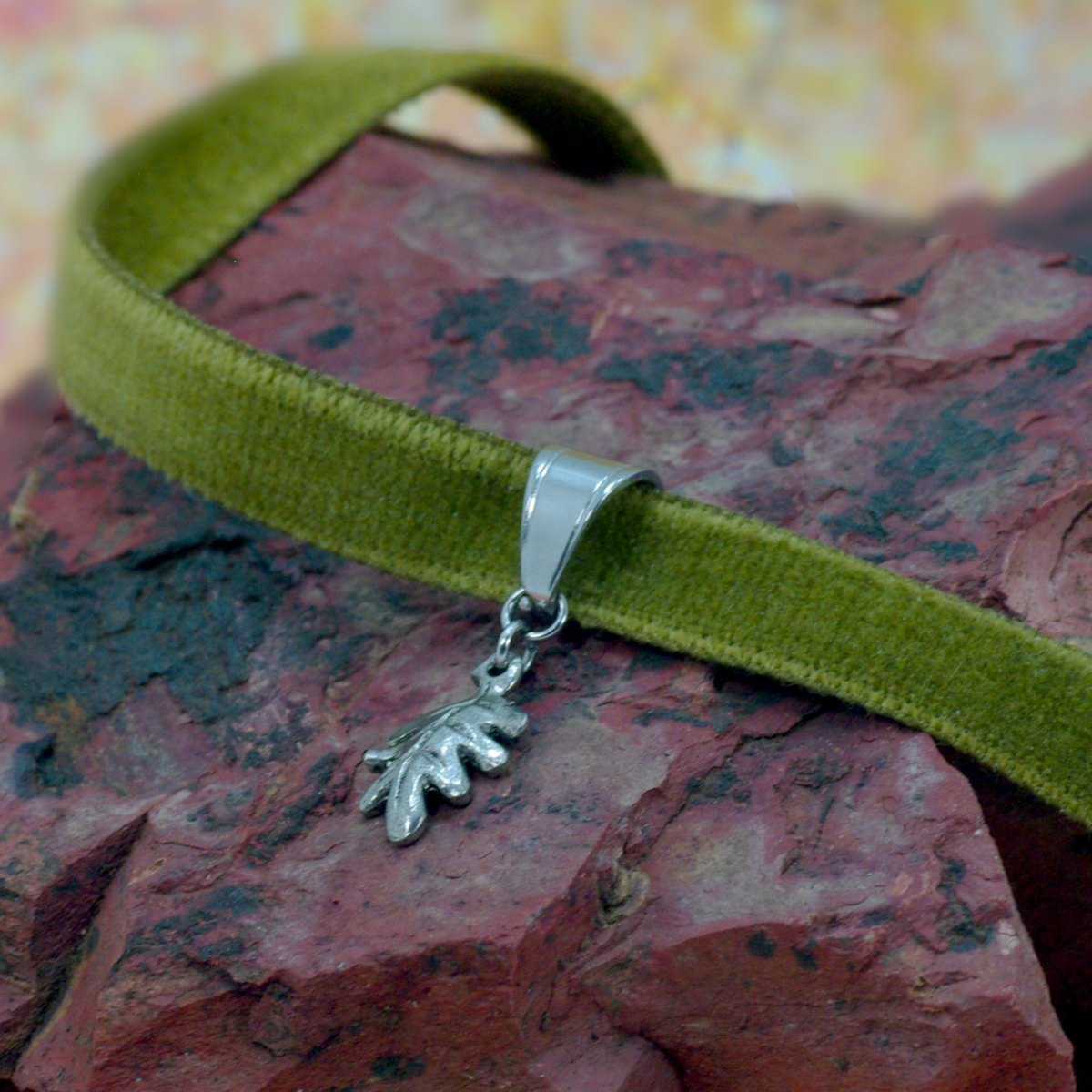 Despite its name, a choker shouldn’t hurt you. This one uses a delicate, olive green Japanese cotton ribbon that’s soft to the touch and drapes beautifully around your neck. The silver oak leaf charm holds a lot of detail for such a tiny thing; a wonderful woodland token to remind you of your true home.